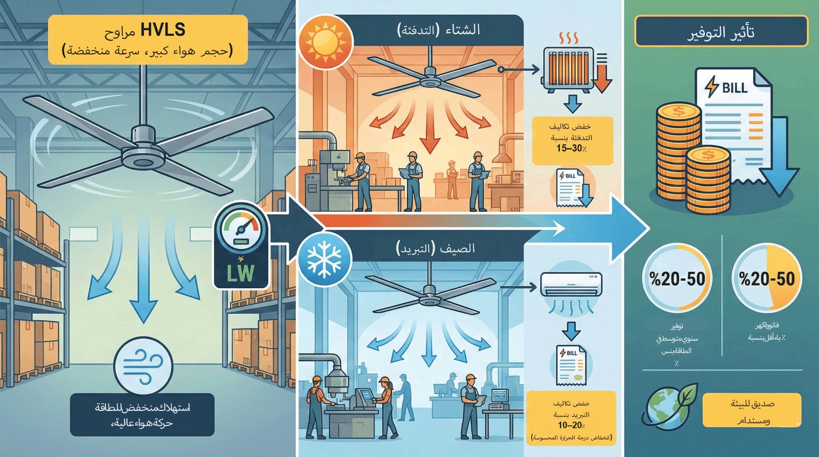 مقارنة تكاليف التشغيل بين المراوح الصناعية القياسية ومراوح HVLS
