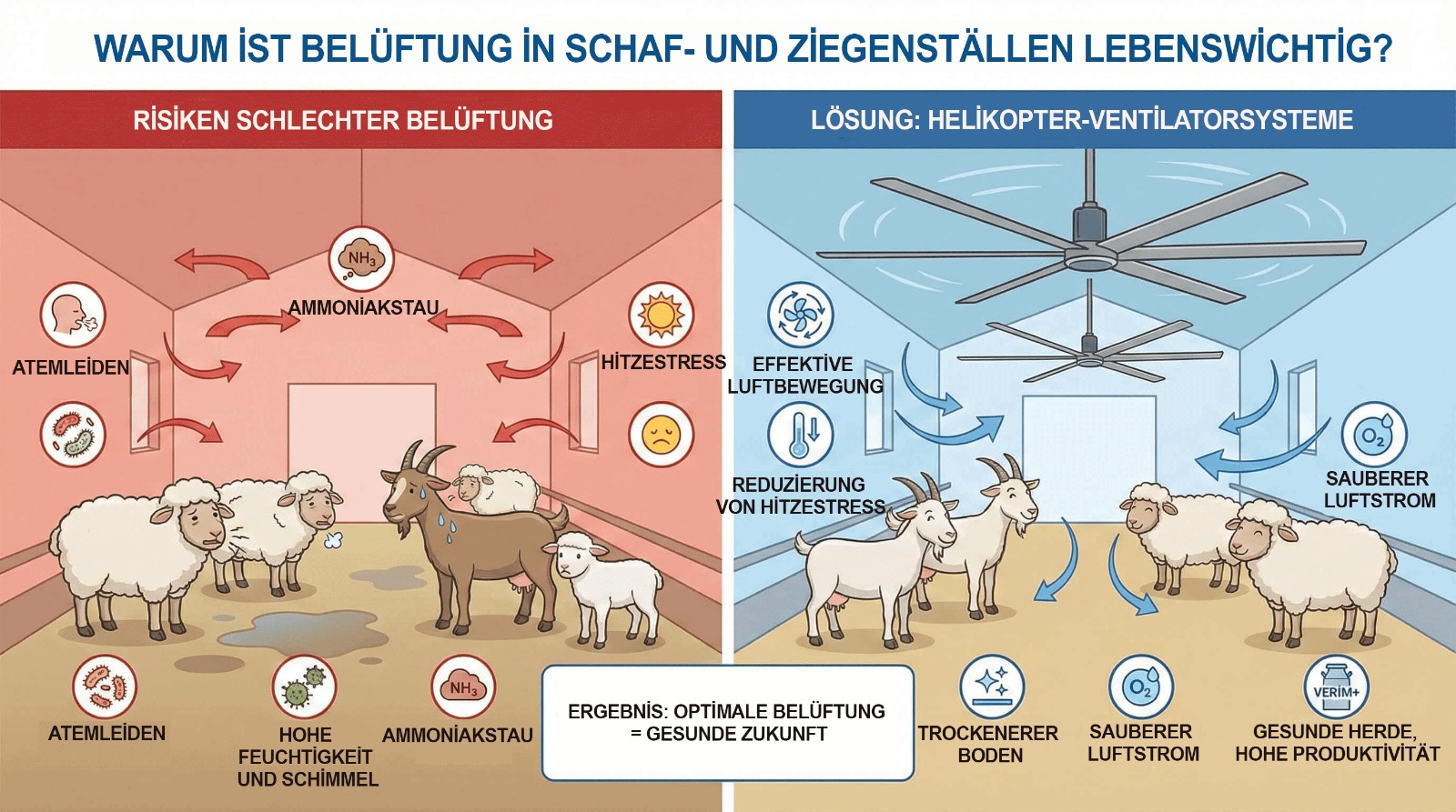 Die empfindliche Lungenstruktur von kleinen Wiederkäuern kann bereits durch geringste Verschlechterungen der Luftqualität in geschlossenen Räumen stark beeinträchtigt werden. Im Stall angesammelte Feuchtigkeit sowie güllebedingte Gase schädigen die Atemwege der Tiere direkt und öffnen die Tür zu schwer reversiblen Erkrankungen. Nicht nur die Beseitigung schlechter Gerüche, sondern auch die kontinuierliche Frischhaltung des Sauerstoffniveaus ist keine Option, sondern eine Notwendigkeit für ein starkes Immunsystem der Herde. Wird keine Frischluftzufuhr gewährleistet, verbrauchen die Tiere zusätzliche Energie zur Regulierung ihrer Körpertemperatur, was unmittelbar zu deutlichen Einbußen bei der Fleisch- oder Milchleistung führt.