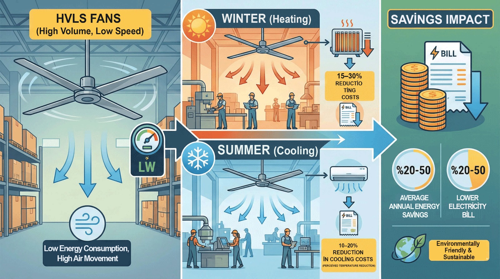 - Energy Consumption Balance: Standard fans operate at high speeds, continuously consuming maximum power, whereas HVLS systems rotate at low speeds, moving large masses with far less energy and sparing the electricity meter.