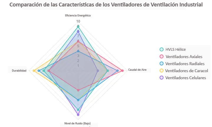 - Ventiladores HVLS tipo helicóptero: proporcionan distribución homogénea del aire en grandes áreas con bajo consumo energético