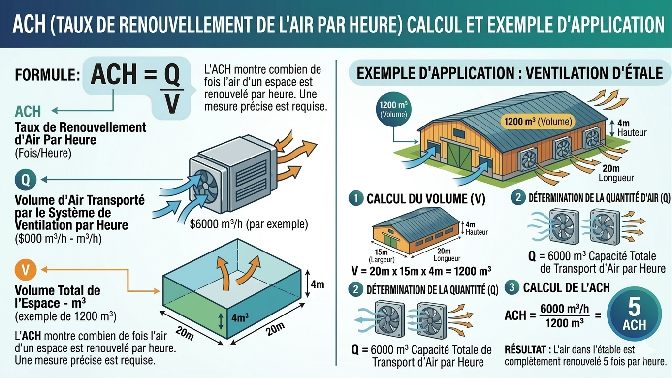 Prenons un exemple pratique. Imaginez une étable de 20 mètres de long, 15 mètres de large et 4 mètres de haut. Le volume de cet espace est de 20 x 15 x 4 = 1200 mètres cubes. Si les ventilateurs utilisés dans l’étable déplacent au total 6000 mètres cubes d’air par heure, la valeur ACH se calcule comme suit : 6000 / 1200 = 5. Ce résultat signifie que l’air de l’étable est entièrement renouvelé 5 fois par heure.