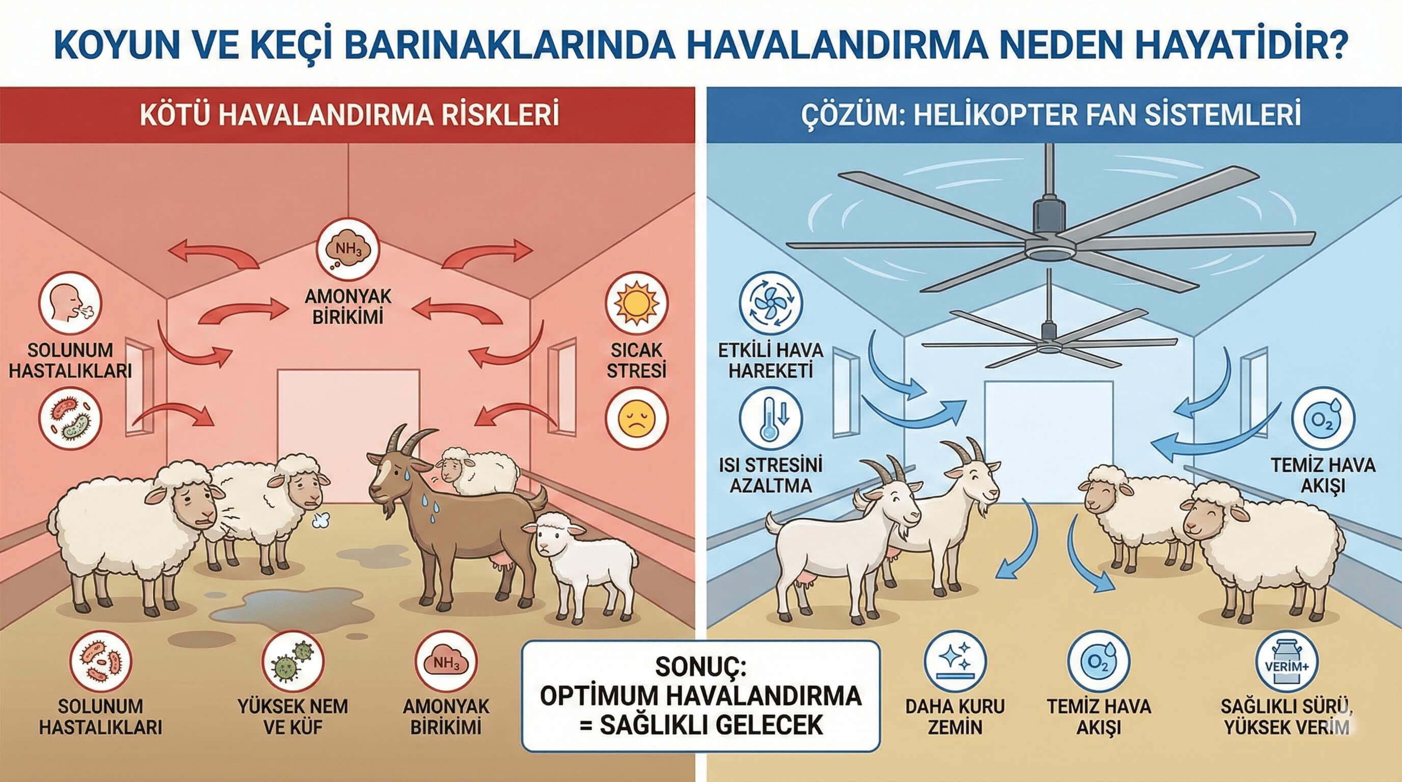 Koyun ve keçi yetiştiriciliğinde verimliliği doğrudan belirleyen en temel unsurlardan biri, barınak içerisindeki hava kalitesinin yönetimidir. Özellikle hayvanların sıcaklık stresine girmesini engellemek ve içerideki kirli havayı tahliye etmek için en etkili çözüm, geniş kanat açıklığına sahip helikopter fan sistemleridir. Bu sistemler, zemine doğru güçlü ama nazik bir hava akımı göndererek barınağın her noktasında eşit serinletme sağlar ve hayvanların solunum yolu hastalıklarından korunmasına yardımcı olur.